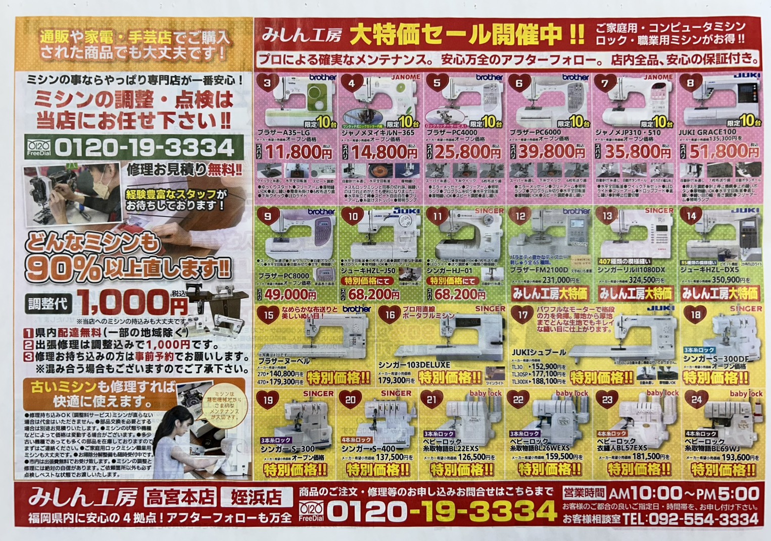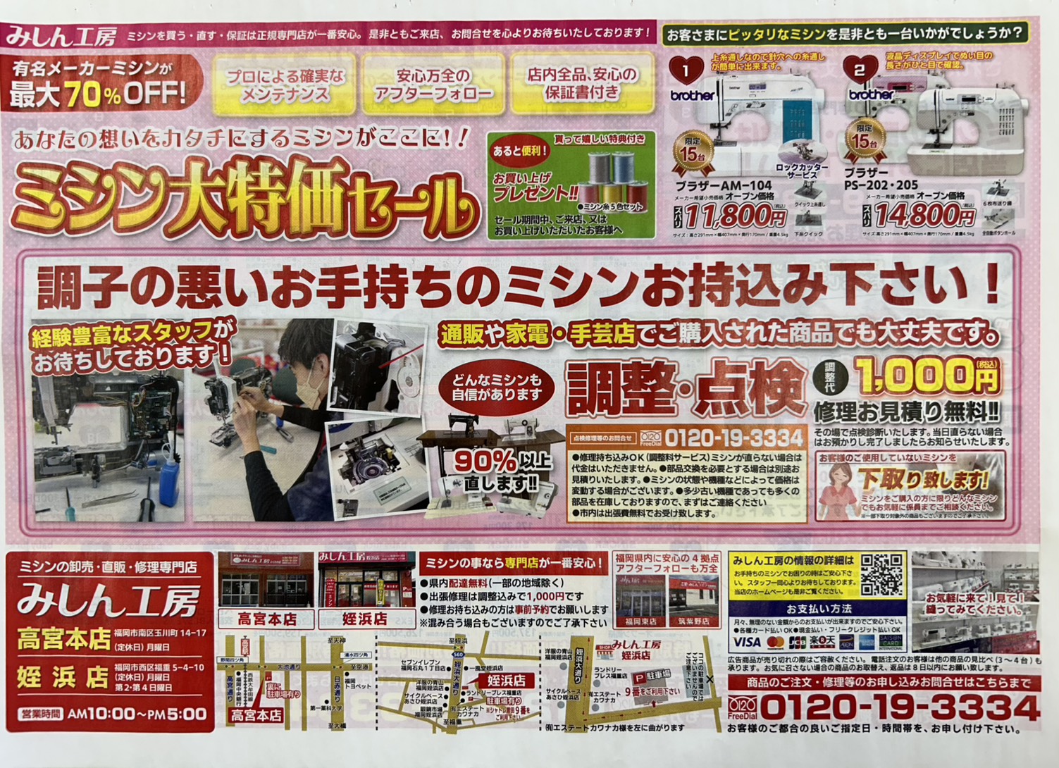 最新の型~昔なつかしい型まで取り揃えてるみしん工房福岡本店です。 ミシンの修理なども行っておりますのでお気軽にお問い合わせ・ご来店ください!駐車場も完備しておりますので車でのお越しもラクチンです。